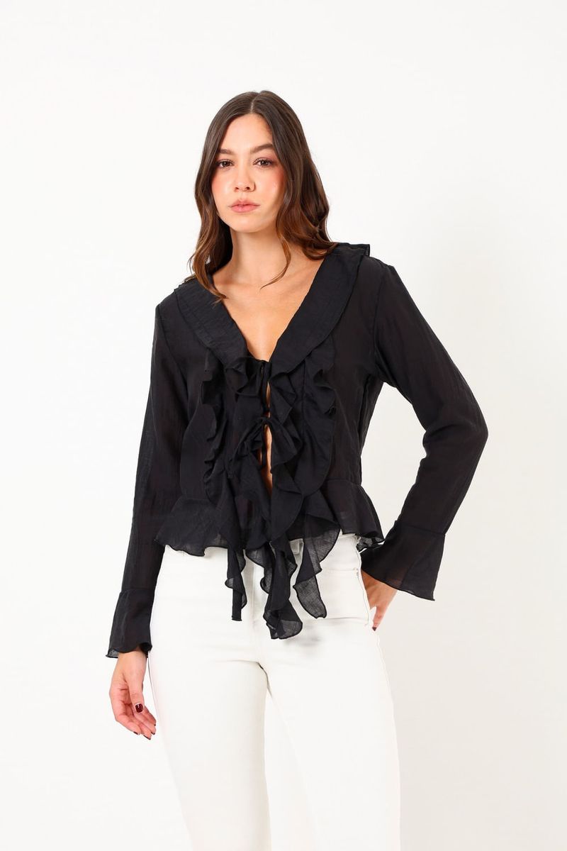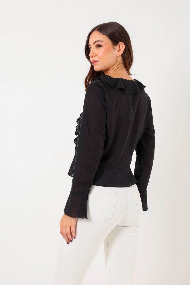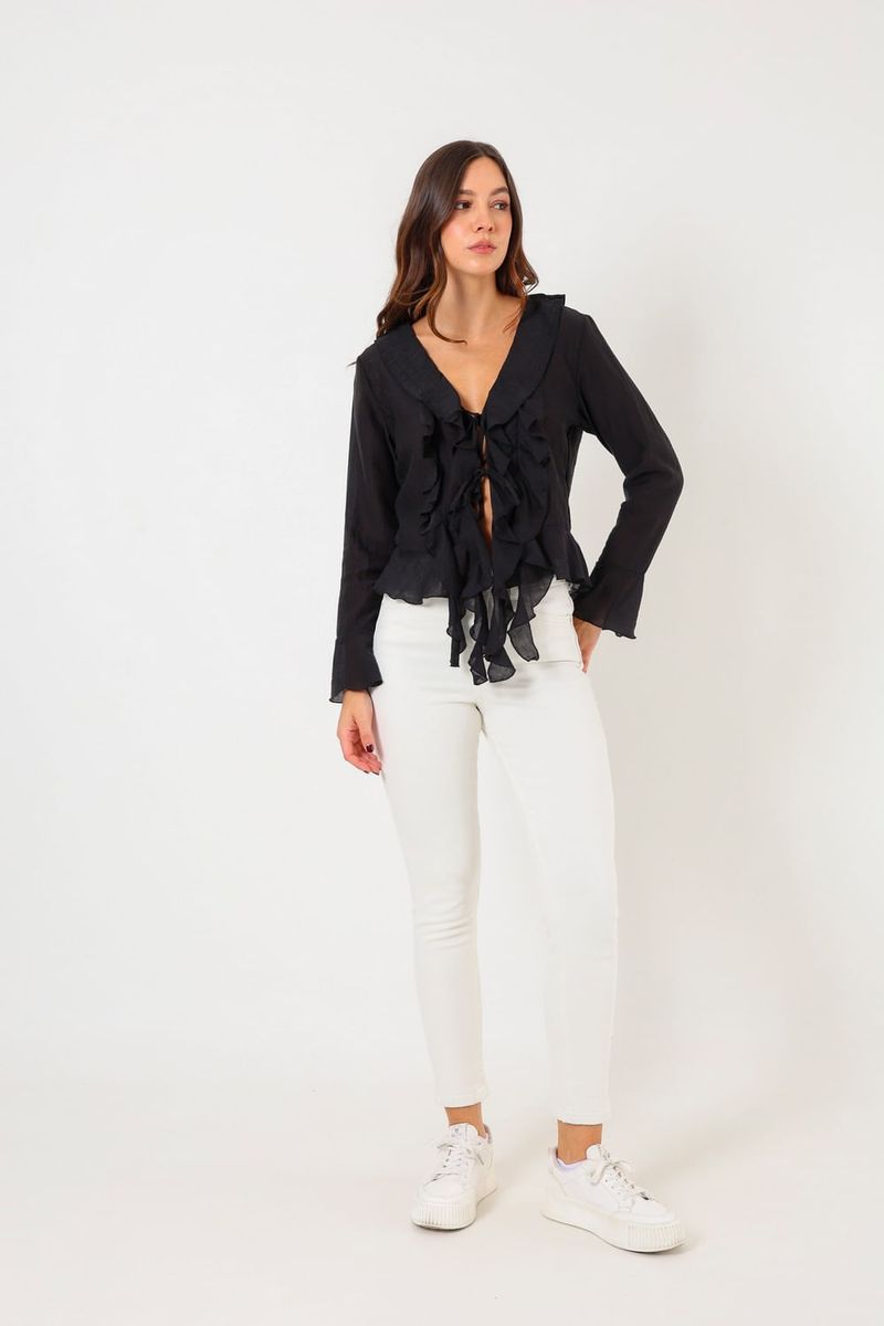 Esta blusa de diseño delicado presenta un hermoso detalle de volantes y un escote en V, ideal para mostrar tu estilo sofisticado en cualquier ocasión. Con su tejido ligero y fluido, ofrece comodidad sin sacrificar la elegancia. Perfecta para combinar con jeans o una falda, esta prenda es versátil y esencial para tu armario.