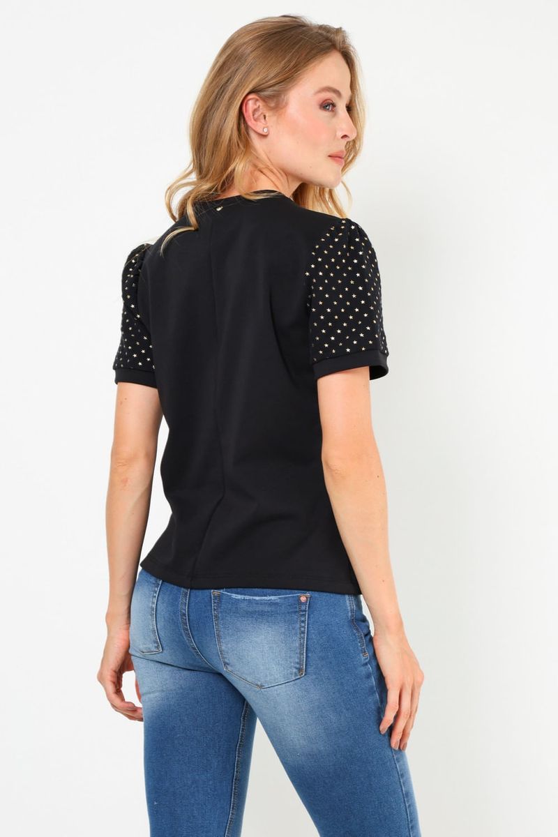 Descubre nuestra camiseta elegante, diseñada con mangas con detalles únicos que añaden un toque de sofisticación a cualquier atuendo. Confeccionada en una mezcla de materiales de alta calidad, esta prenda asegura comodidad y un ajuste perfecto. Ideal para el día a día o ocasiones especiales. Combínala fácilmente con jeans o falda para un look chic.