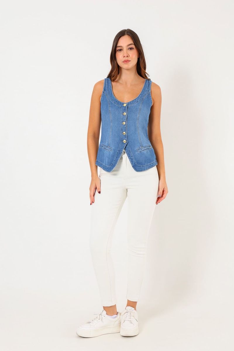 Este chaleco denim es la prenda ideal para cualquier ocasión. Con un diseño moderno y cómodo, cuenta con botones frontales y dos bolsillos laterales. Perfecto para combinar con tus outfits favoritos, ya sea sobre una blusa, t-shirt o con un vestido. Su corte favorecedor resalta la figura, haciéndote sentir segura y a la moda en cualquier momento del día.