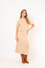 Descubre nuestra falda tejida, una prenda versátil y elegante que combina confort con un diseño moderno. Ideal para cualquier ocasión, su tejido de calidad ofrece una caída espectacular y un ajuste perfecto. Combínala con tu parte superior favorita y tus botas para un look que no pasará desapercibido.