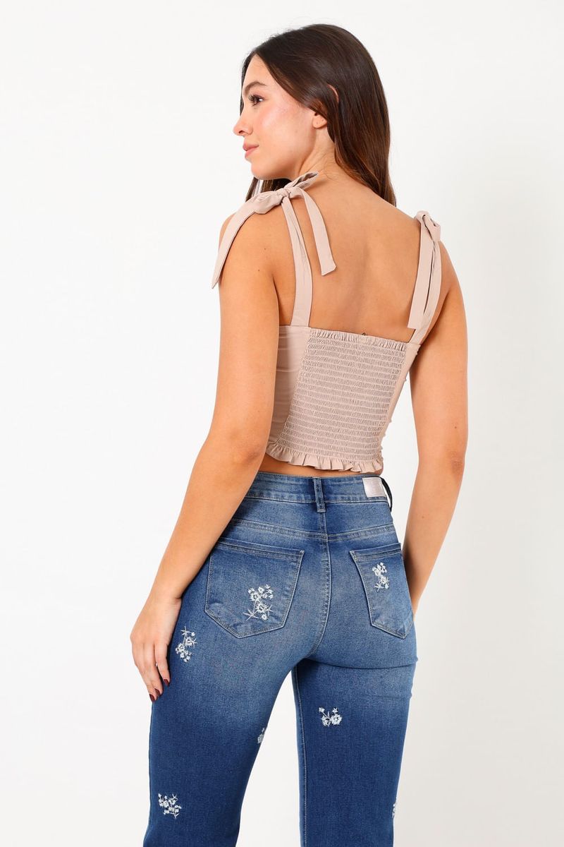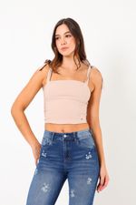 Este top ajustado presenta un diseño moderno con tirantes que se pueden anudar, brindando comodidad y estilo. Ideal para cualquier ocasión, desde un día casual hasta una noche especial. Su tejido suave se adapta perfectamente al cuerpo, acentuando tus curvas de manera favorecedora. Combínalo con tus jeans favoritos para un look sencillo pero impactante.